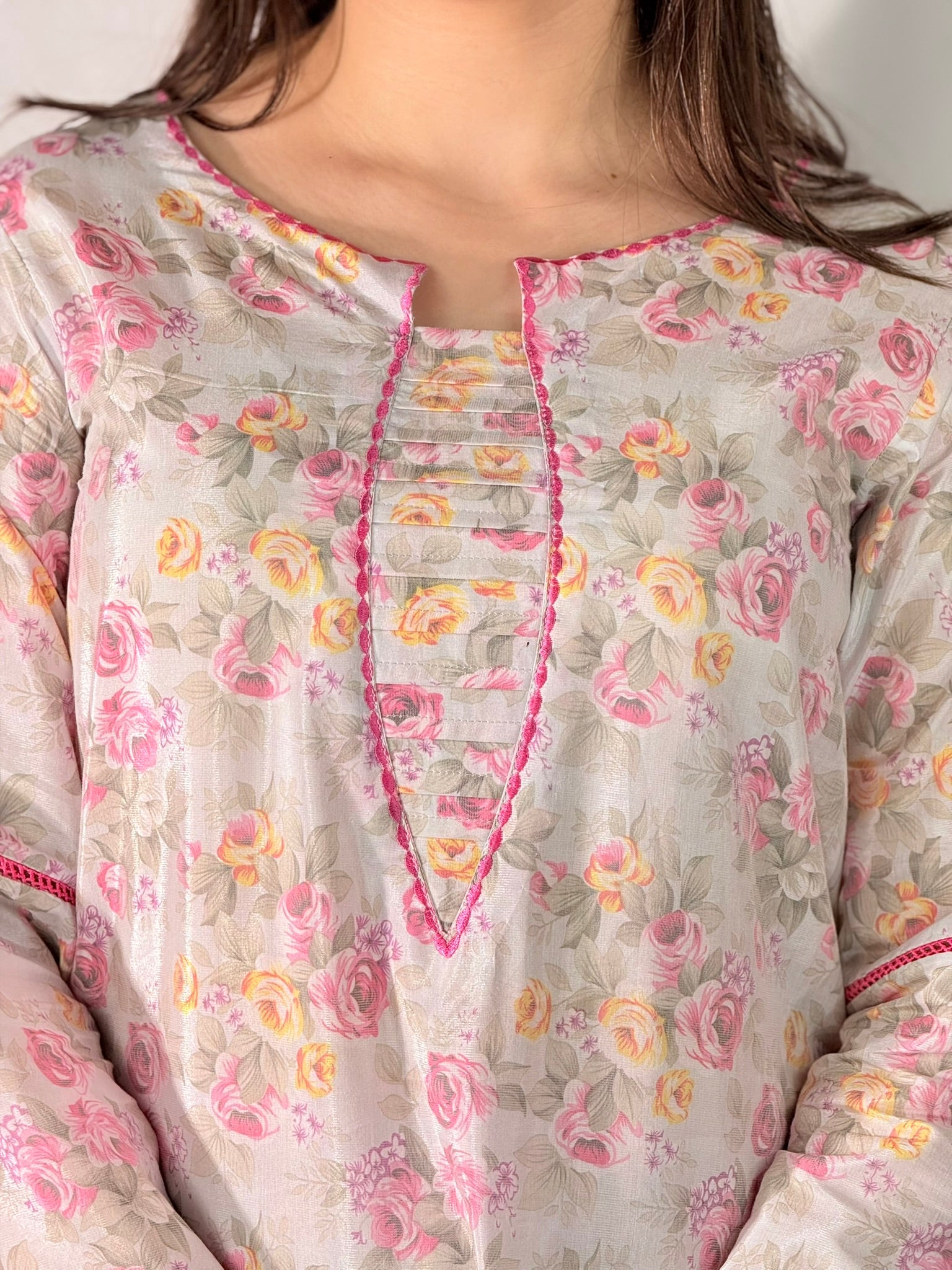 The kurta features a rounded neckline with a graceful keyhole slit, framed by a central pin-tucked panel and outlined in contrasting pink piping, giving the bodice a structured yet soft appearance.