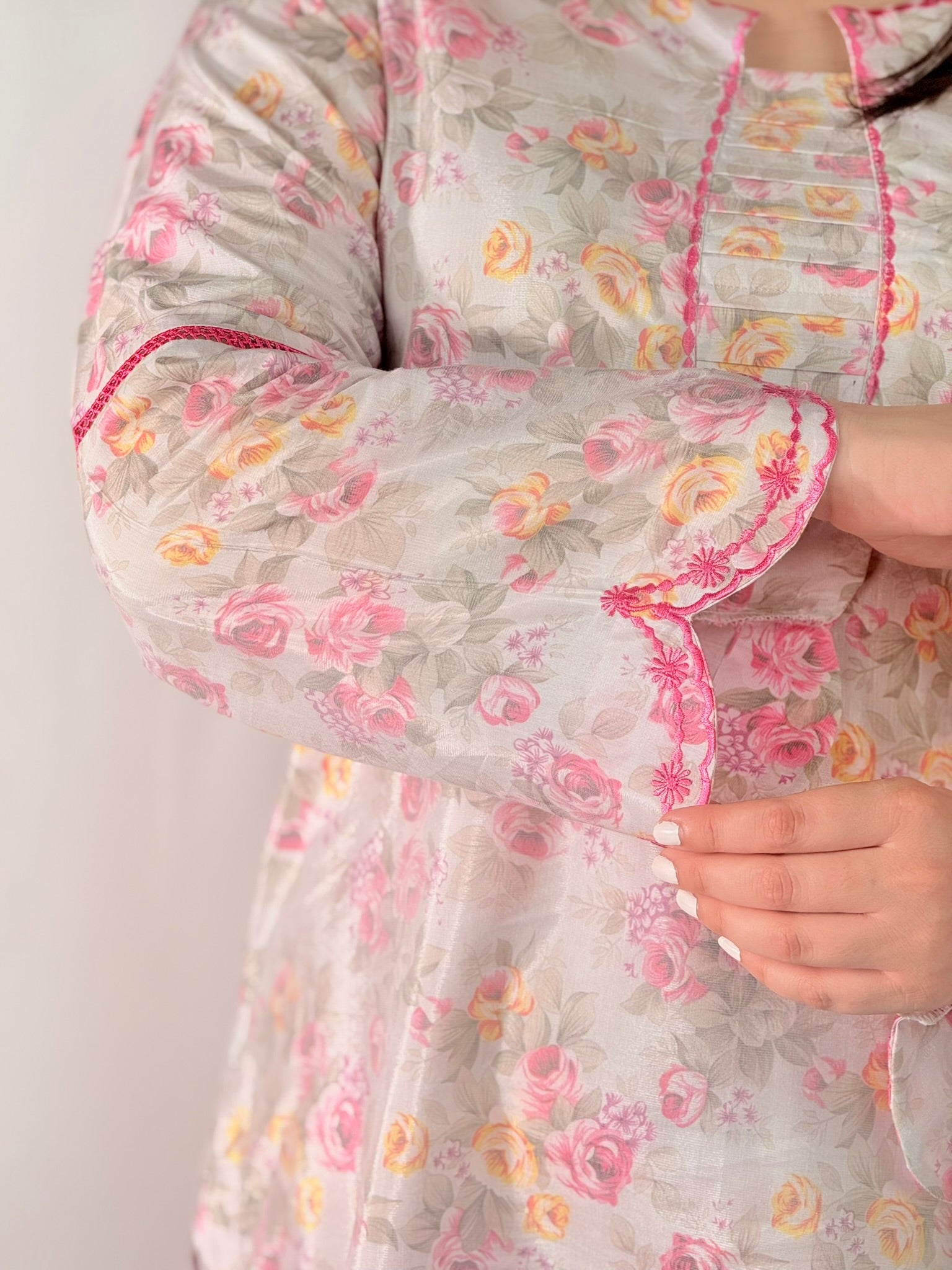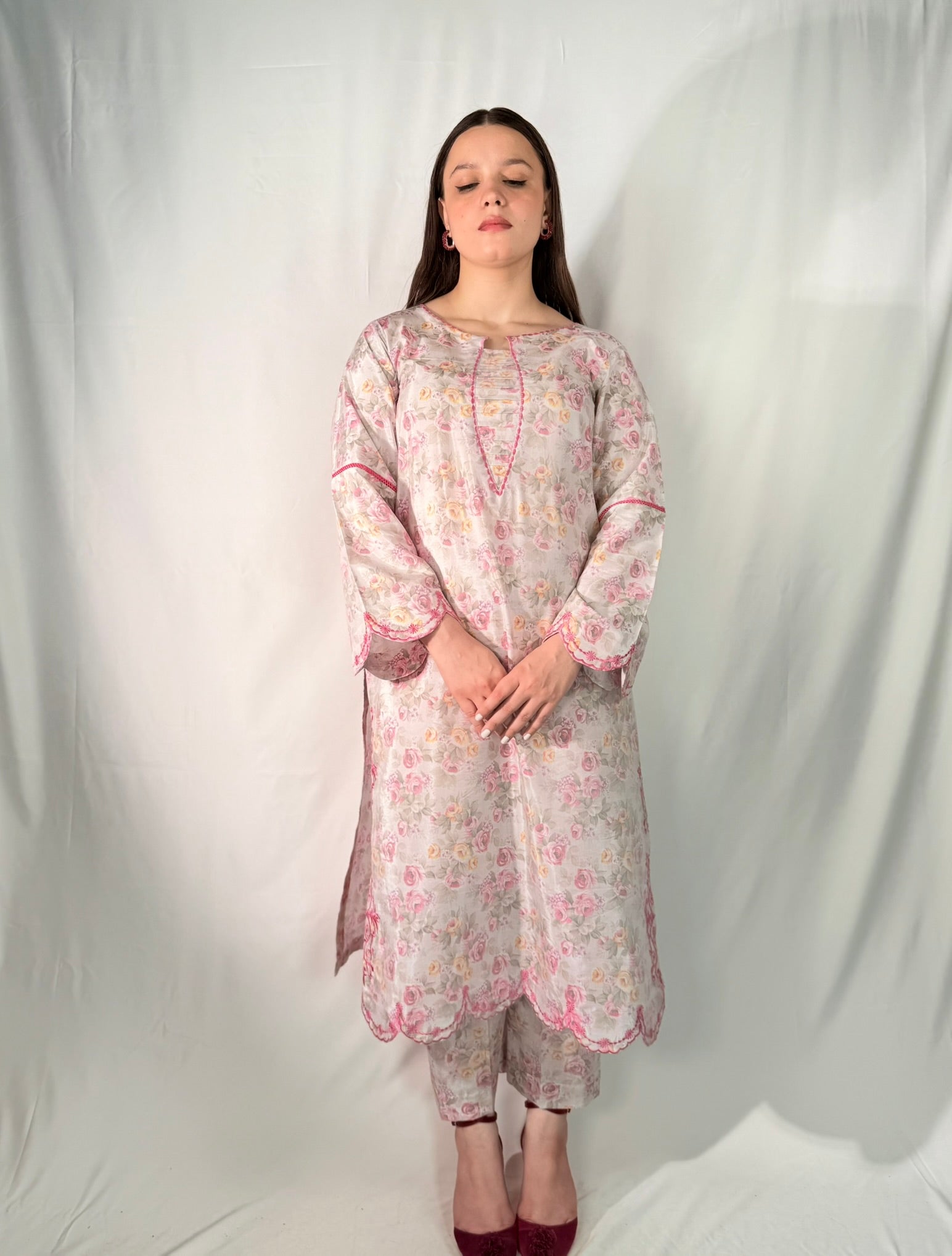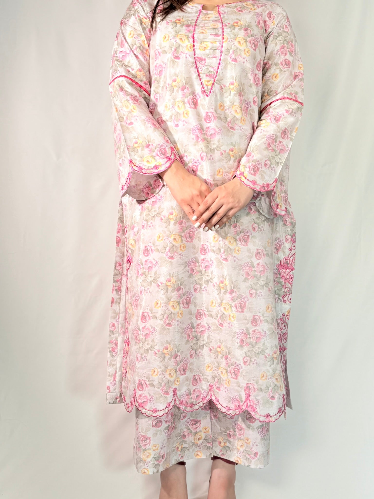 The highlight of the silhouette lies in its scalloped border hem, featuring intricate rose-pink threadwork that mirrors the floral print—offering elegance in every detail.